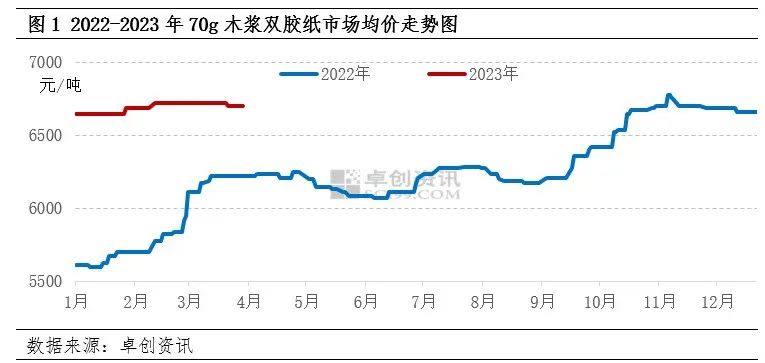 2023年一季度,木漿雙膠紙價格重心小幅上行后趨穩運行,3月末市場出現個別松動。如圖1所示,2023年一季度木漿雙膠紙市場均價為6694元/噸,較去年四季度環比上調0.48%,較去年一季度同比漲幅為13.84%。