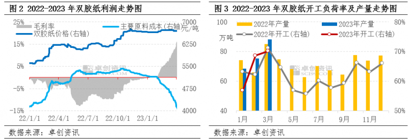 從成本利潤來看,一季度雙膠紙行業利潤有較明顯提升,主要原因是在出版黨建訂單支撐下,雙膠紙價格堅挺,同時上游紙漿價格持續下行,雙膠紙行業利潤和去年相比,實現扭虧為盈。如圖2,截至3月31日,木漿雙膠紙行業毛利率為15.67%,較2022年末增加15.95個百分點,較2022年3月底增加19.30個百分點。