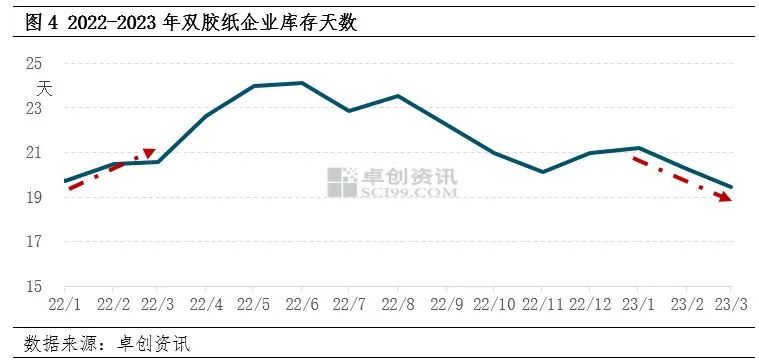 反觀需求層面,每年3月進入出版招標旺季,今年另有部分黨建刊物類訂單支撐,整體出版需求向好,2月紙廠出貨節奏較好,如圖4所示,2023年雙膠紙企業庫存進入去庫階段,庫存天數較1月初下滑7.08%,降至相對低位水平,一定程度上支撐雙膠紙市場價格小幅探漲。但值得注意的是,3月中下旬部分社會訂單表現轉向僵持,受漿價持續下行等因素影響,一些下游單位采購節奏有所放緩,市場觀望氣氛漸濃。同時一些終端外貿衍生訂單有待恢復,一季度末部分貿易商為增快走貨節奏,價格出現小幅松動。