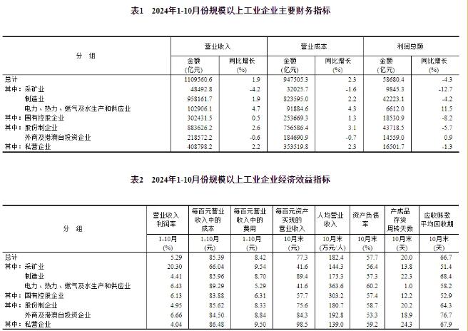 1—10月份,規模以上工業企業實現營業收入110.96萬億元,同比增長1.9%;發生營業成本94.75萬億元,增長2.3%;營業收入利潤率為5.29%,同比下降0.34個百分點。