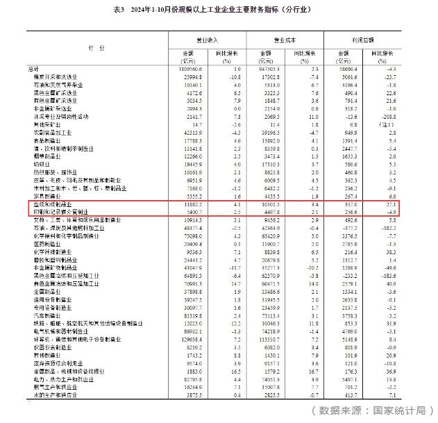 11月27日,國家統計局網站發布2024年1—10月份全國規模以上工業企業利潤情況。數據顯示,1—10月份,全國規模以上工業企業實現利潤總額58680.4億元,同比下降4.3%。